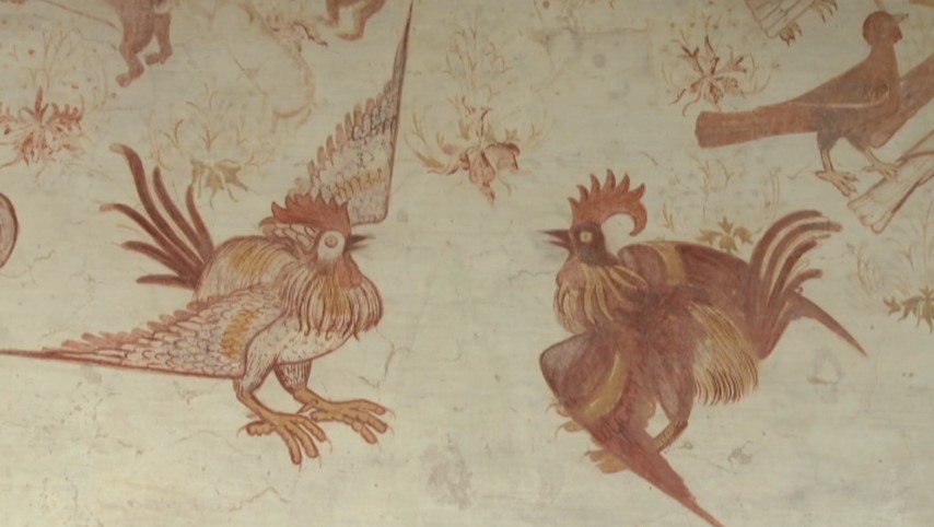 Numa época em que a arte religiosa dominava, estas pinturas mundanas contam histórias profanas com uma intenção moralizadora e uma dimensão crítica ao poder político e amoroso, sublinha Joaquim Caetano, guia deste episódio do programa Visita Guiada. Mas que fábulas e metáforas revelam estes animais fantásticos, seres mitológicos e oníricos que convivem harmoniosamente nas paredes e tetos destas Casas Pintadas com aves domésticas e outros animais que todos reconheciam? Que significado têm cada um destes quatro painéis que faziam parte de uma espécie de jogo palaciano para os nobres decifrarem?